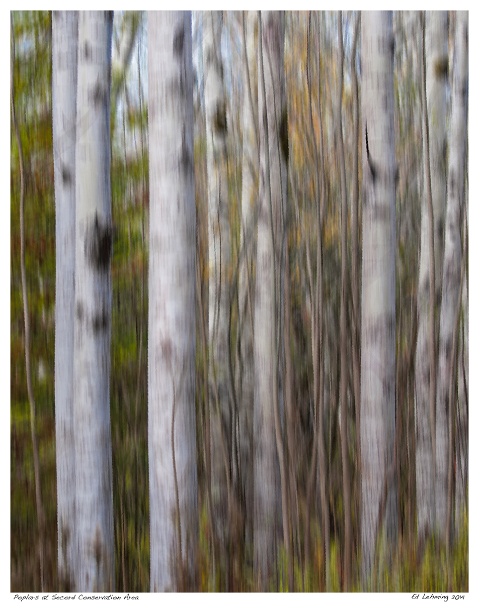 This is one of my all time favourite tree abstractions. It was a mid fall day and the light was soft but bright. It was a time of transition. Many of the leaves had fallen and the underbrush was thinning. In the background, you can make out the yellow leaves of other poplars as well as the bright greens of balsams. The saplings among the poplars seem to be dancing with motion. It reminds my of some fairy tale scene and gives the impression of a painting, rather than a photo.