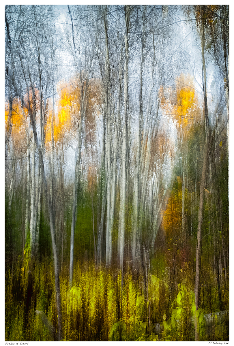 A return to my previous location. Actually, the same day and about 100 yards away from the location where I photographed the Poplars at Secord image posted yesterday. This is a stand of birch trees photographed in the same ‘abstraction’ style I have become so fond of. Essentially, I look for strong vertical elements and background colours. This particular time of year (Mid-late October) lends itself well to the technique because of the feel of the slightly diffused light and the presence of bright colours that jump out of the background.