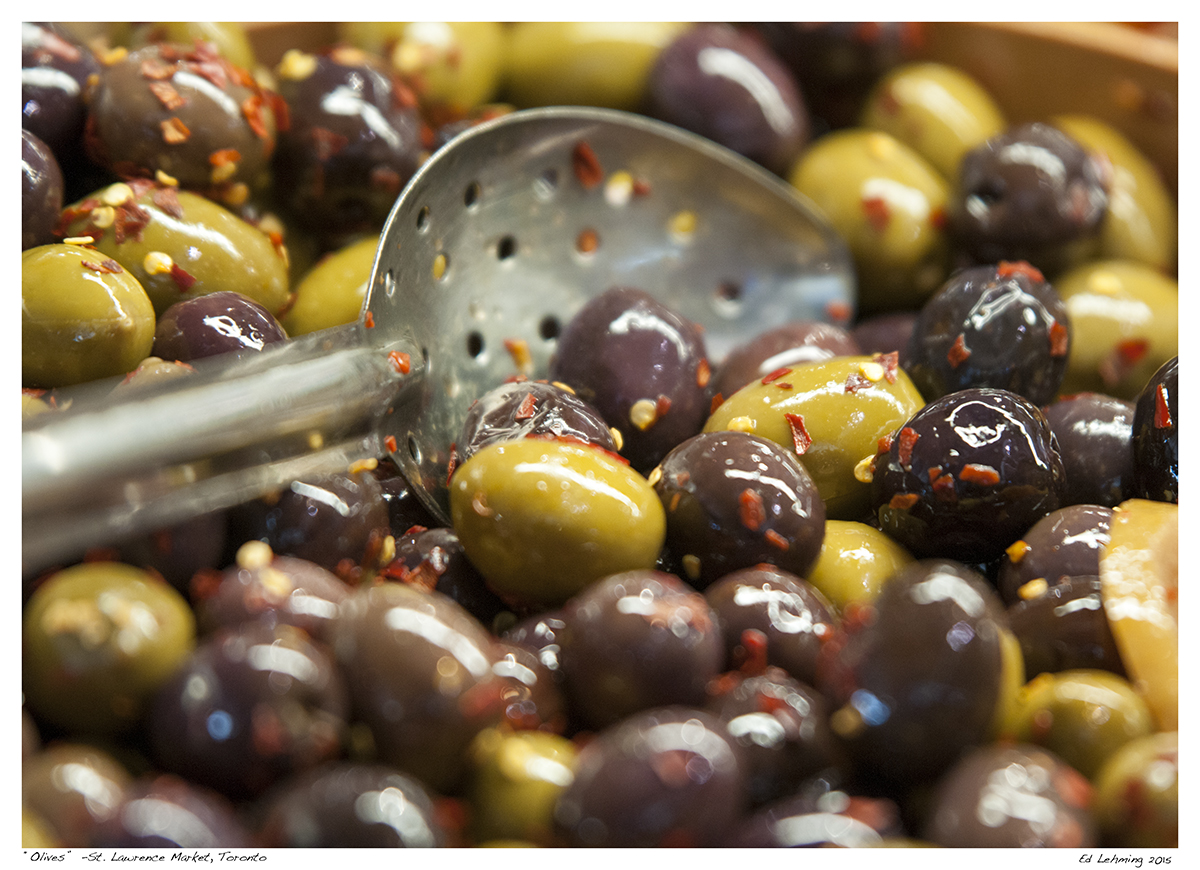 OK, a photo for my foodie friends. Who can resist a good olive? This is a photo of one of the many olive and cheese vendors at the St. Lawrence Market in Toronto. The market offers a huge variety of fresh foods to suite almost any taste. It is colourful and busy and a must if you like food.