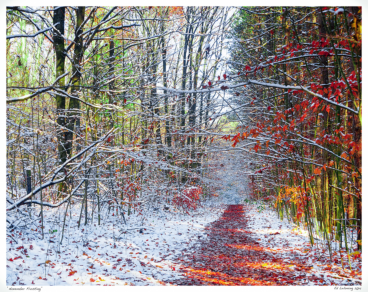 On this occasion, the trail in was covered in wonderful orange oak leaves and the snow had largely melted off, due mainly to the foot traffic. The bright leaves, combined with the late day light, made the entire scene glow. Even the yellow-green undergrowth seemed alight with sunshine as an archway of snow covered branches stretched above ahead of me. The colours where incredible and I look back on this moment as one of those special times when I was fortunate to have my camera with me so I could save and share the moment.