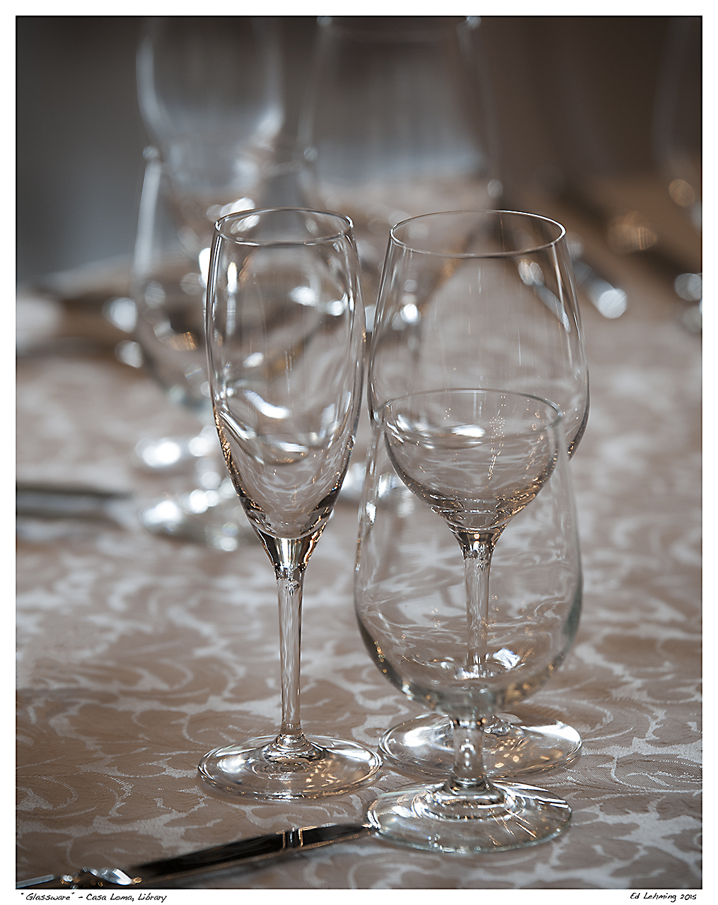 I love the way light plays through glass. In this case, a set of glasses set up for a formal dinner in the Casa Loma library. We did the ‘tourist’ thing a week ago with our cousins from California. It’s been a very long time since I have visited Toronto’s castle. The library is a large room that has been repurposed as a formal dining room and these glasses were set up on one of the many tables.