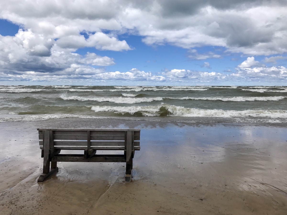 Despite the winds and raging waves, the park bench sat surrealy serene, made more surreal by the distant blue skies and clouds.