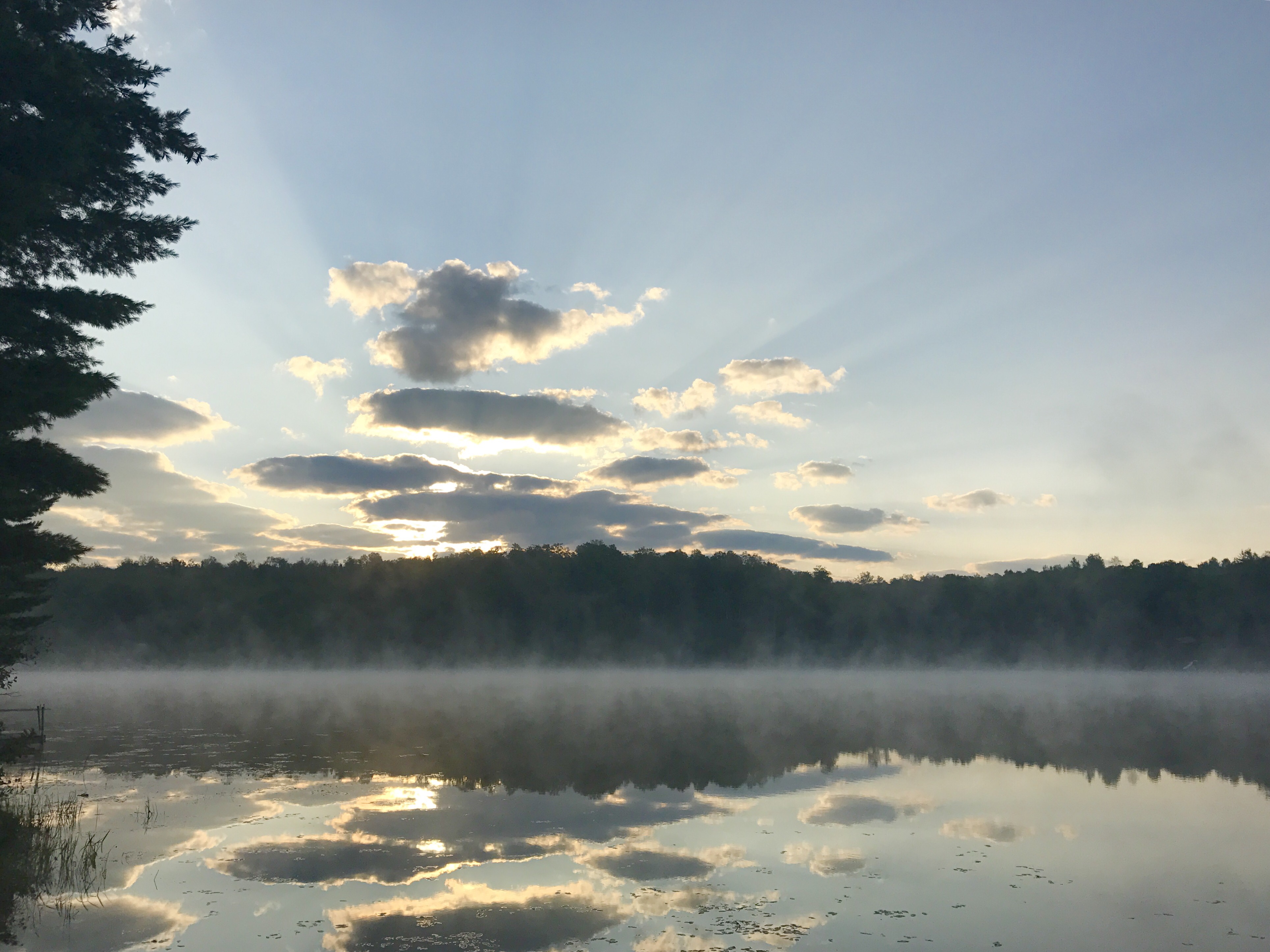 A beautiful, cool dawn on Bancroft’s Marble Lake. The mist swirls gently on the water’s surface, as the sun rises behind a low ridge.   A pattern repeated throughout the summer, each time, slightly different.