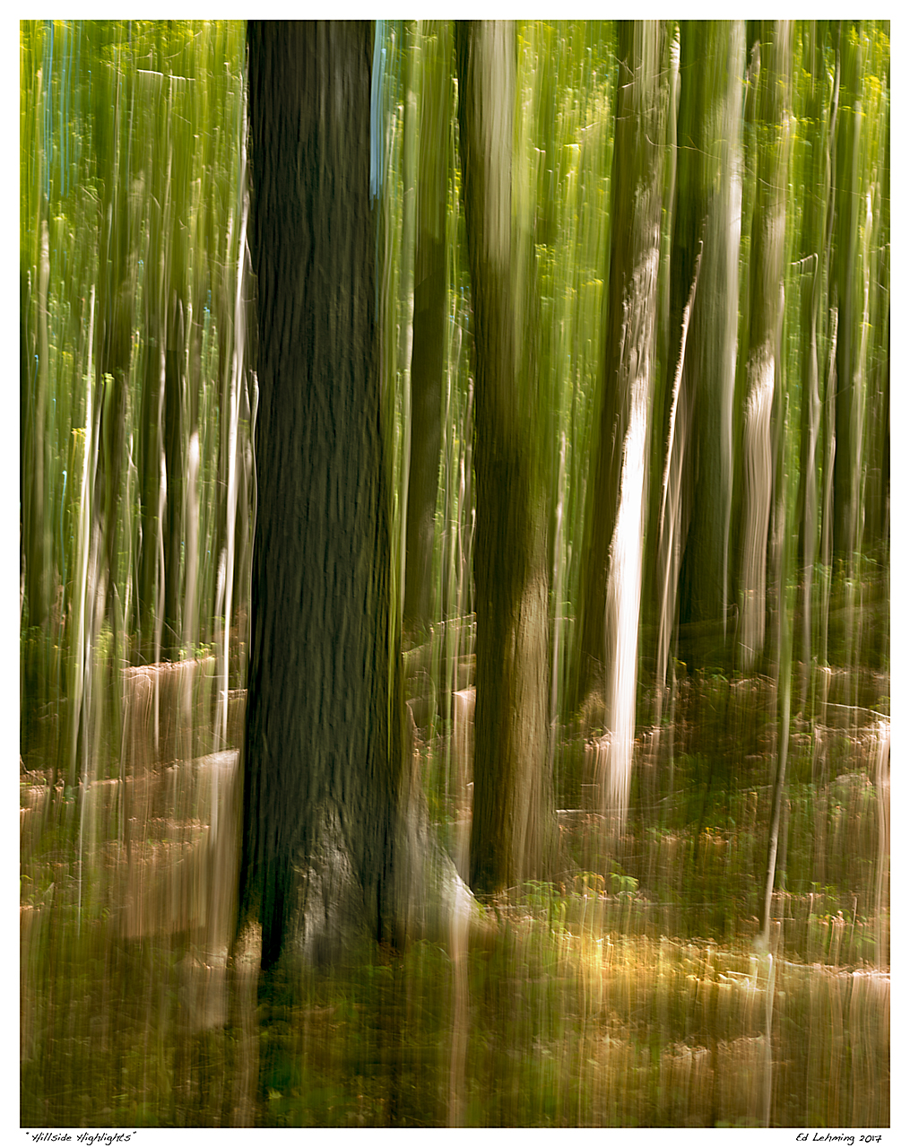 The resulting image contains all the elements which I originally saw: the gently sloping hillside, the trees, lined up as if marching up the hill, pright patches of light filtering the forest canopy, and a thin sliver of bright blue sky to set it all off, all within the green veil of light that fills the whole scene.