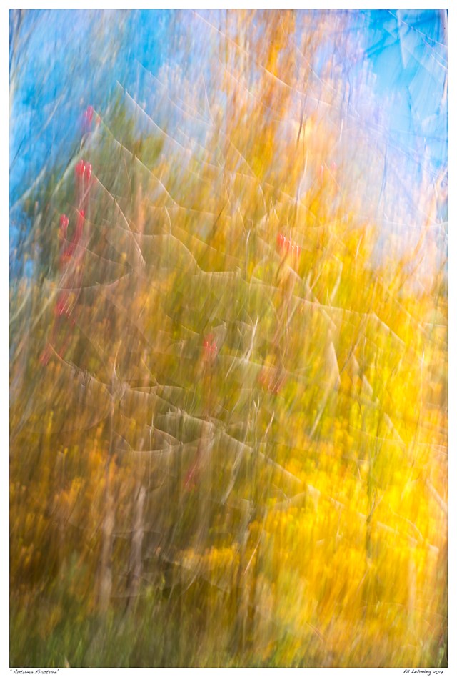 The title for this image came quickly, prompted by the ‘cracked’ look of the image, caused by a weave of bright white branches across the frame. The image is like a summary of the fall colours, from bright yellows, to reds, and splatterings of red.