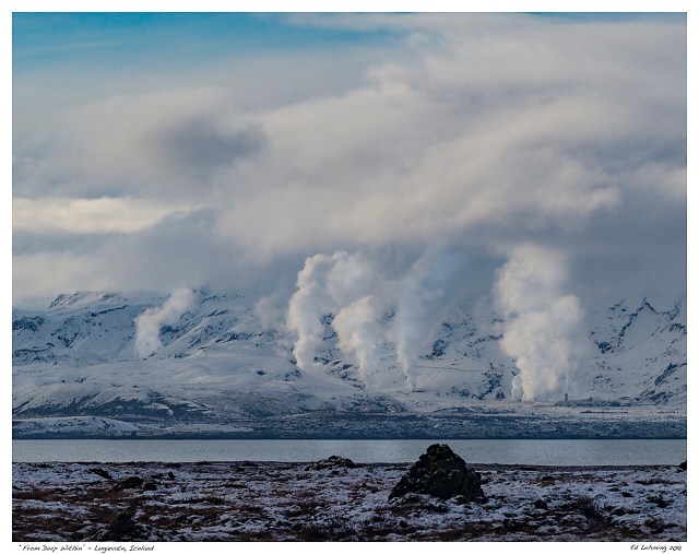 As I said, the trip took us inland and into more high plateaus, which were fairly unremarkable except at this highland lake near Laugarvatn, the far shore filled with geothermal plants and vents, belching out steam into the cold sky , which stood in contrast to the snowy hillsides.
