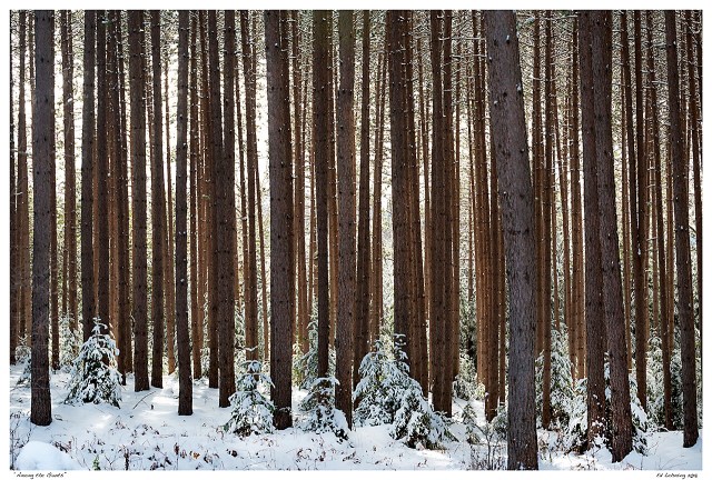 So, when I came across this plantation of trees near Bancroft, Ontario, I could not help but notice the growth of young trees among their mature ancestors. Truly, among the giants and bathed in the soft winter light.