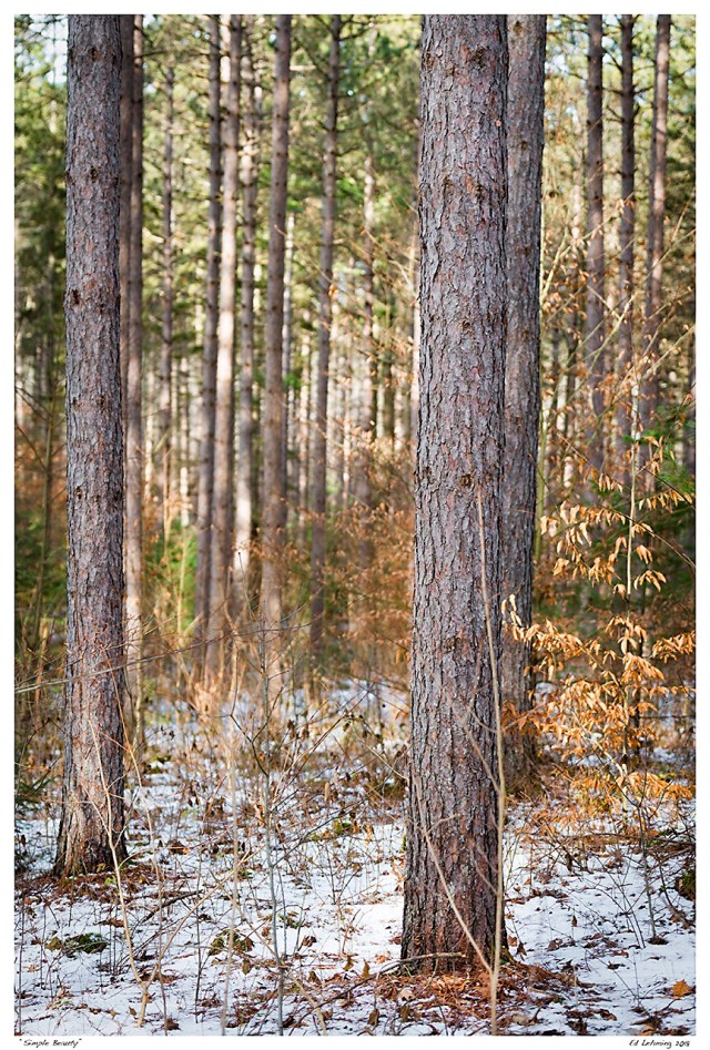 It’s scenes like this, within a planted forest in transition, that make me stop and look deeper. Beneath the canopy of planted red pines, new growth emerges in the form of young red pines and beech trees. There are other shrubs emerging too but the bright green of the pine and the twinkling gold of the beech trees in the afternoon sunlight is almost magical to me and they stand out from the scene. It may be a simple composition, but it does what I intend, it captures the ‘feeling’ of this small patch of forest on a late December afternoon, through colours and texture. And for me, that is beautiful. I can almost feel the rough bark of the pines and hear the birds singing high in the branches above me.
