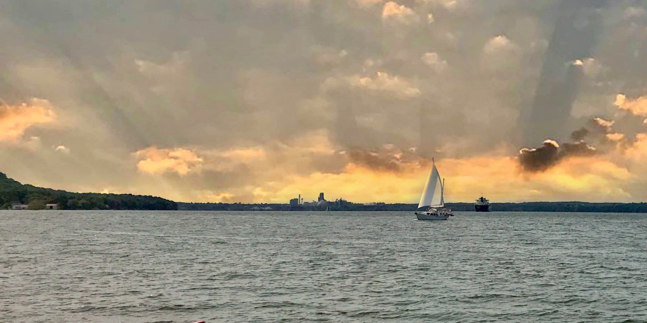 I also like the feeling for floating across the water in my vehicle and the trip offers a different perspective of the bay. In this case, there is a sailboat a few hundred meters away from the ferry and just behind it a large ‘laker’ transport ship heading to the local cement plant for a load. These ‘lakers’ are massive ships that transport goods from port to port in Ontario’s Great Lakes, thus the name. Many are also ocean going and make the long trek east on the St. Lawrence River, eventually entering the Atlantic Ocean.