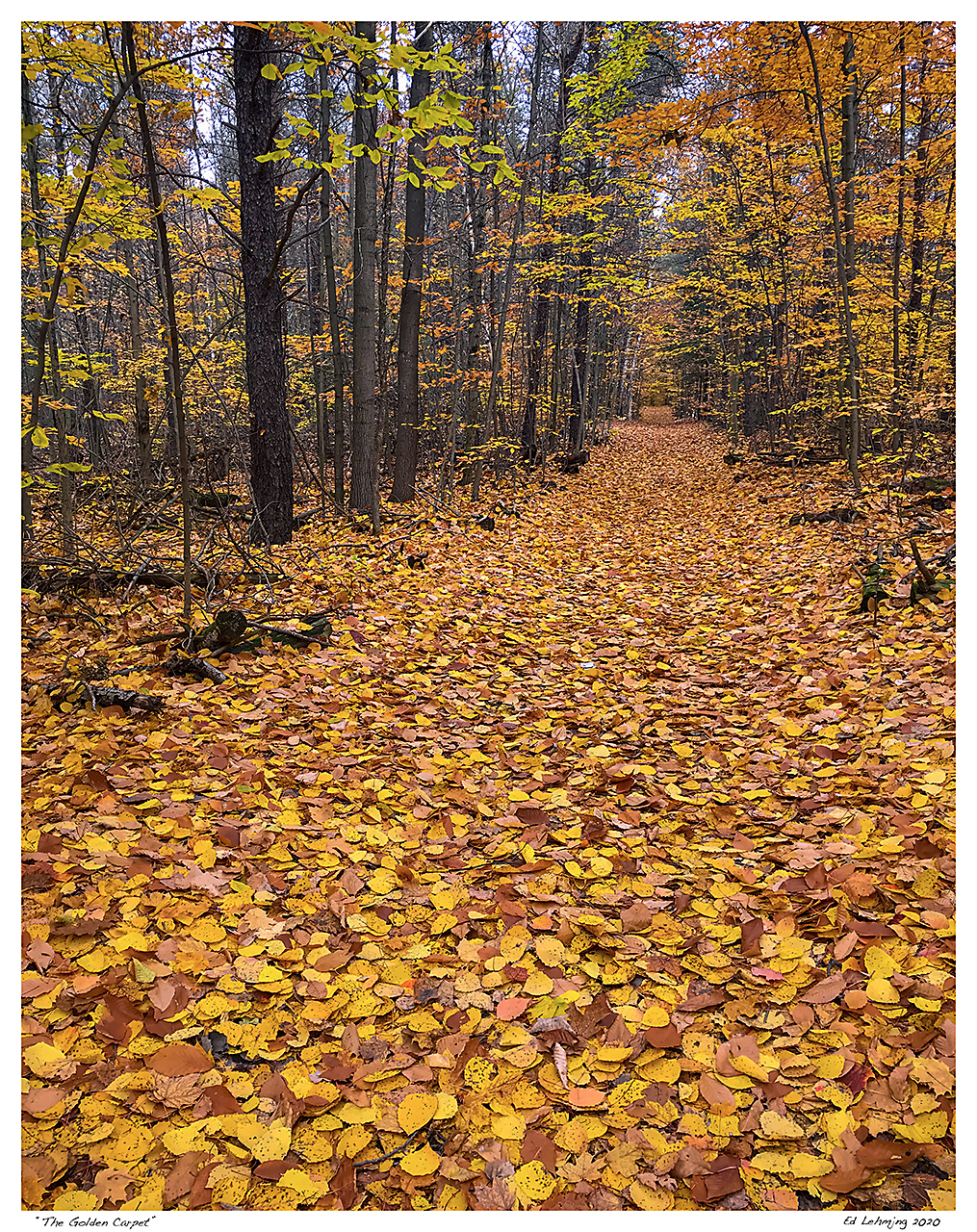 “Before me spread a carpet of freshly fallen leaves, pristine and undisturbed, like a ribbon of gold, drawing me forward into the serenity of the autumn forest.” – Ed Lehming