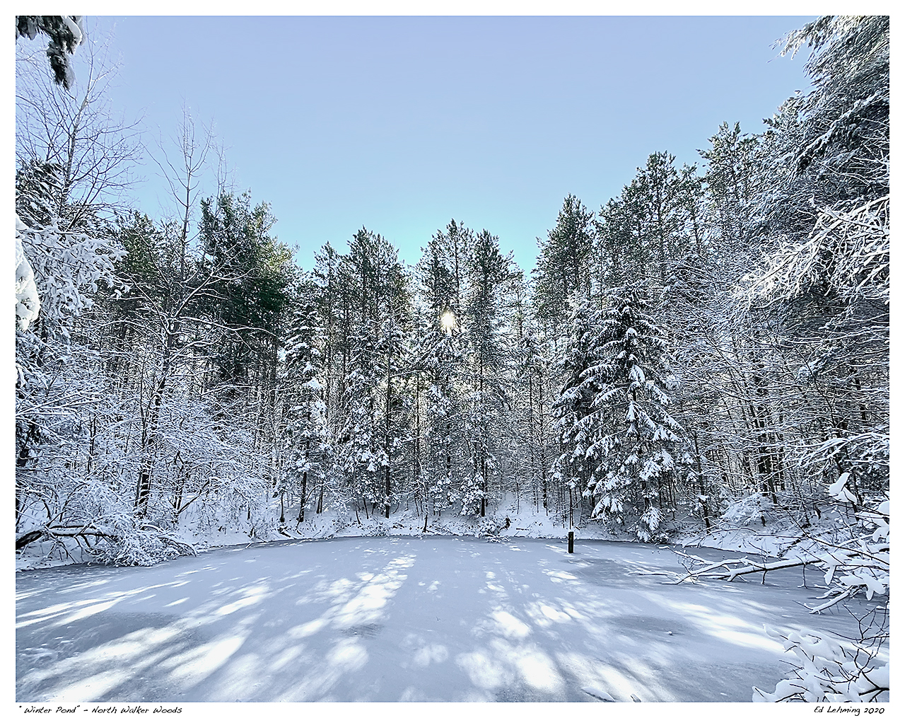 “The new fallen snow filled the trees that surround this quiet pond and the sun cast long shadows over it’s freshly frozen surface.” – Ed Lehming
