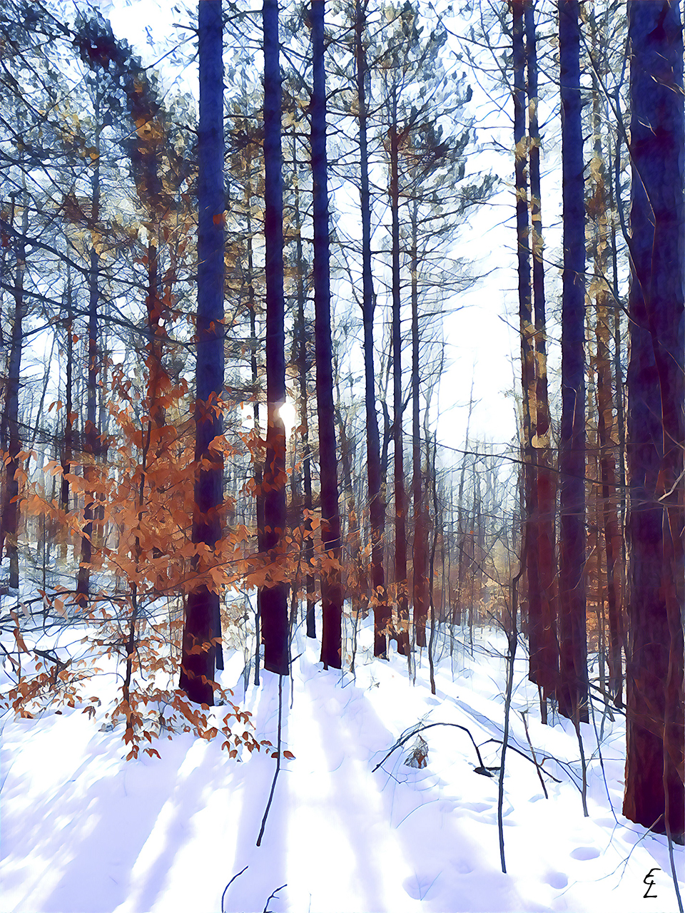 I’m looking for something to pull me out of this creative slump and general laziness, wanting to do more than just share the occasional image. So, I’m taking a kick at it today, with an image I created while on a hike last week. The original photo was ‘nice’ but I wanted to emphasize the way the low sunlight played between the pines and within the bright orange leaves of the beech trees.