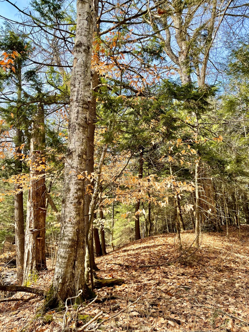 As my hike continued I made some photos of a gently flowing brook and as I completed my shots I heard the distinctive sound of a Barred Owl, hooting deep in a pine grove. I followed the sound and caught a glimpse of the owl departing its roost for a nearby tree with a better vantage point of me. I slowly approached it and got some decent images, which I will share in an future post. Owls are fascinating creatures and I stood on a hillside simply admiring it as it looked back at me, taking time to groom itself every now and then before departing. Once my own time was concluded, I turned to head back to the trail to experience the scene above. It looked like late fall with a few orange leaves still hanging on and bright sunlight shining through the canopy. It was lovely but somewhat confusing, yet all a part of this wonderful day out in nature.