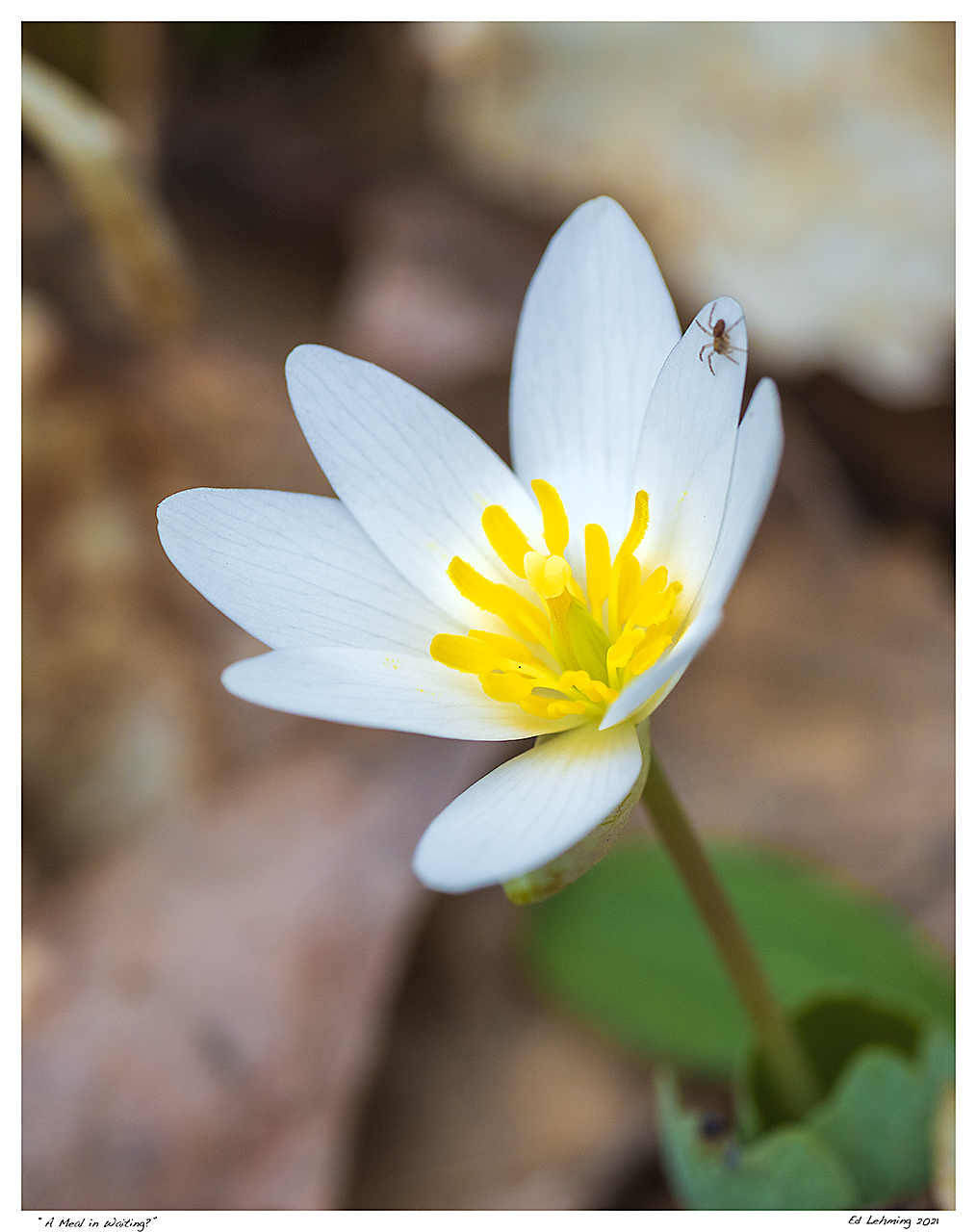 I was enjoying some Spring Beauties (yet to be shared) and noted a small splash of white just to my left. It was the first bloom of Bloodroot, which I was expecting to bloom this past week. My timing must have been just right, as it had only recently opened, it’s leafy ‘cloak’ still tightly closed, with just the blossom to mark its presence.
