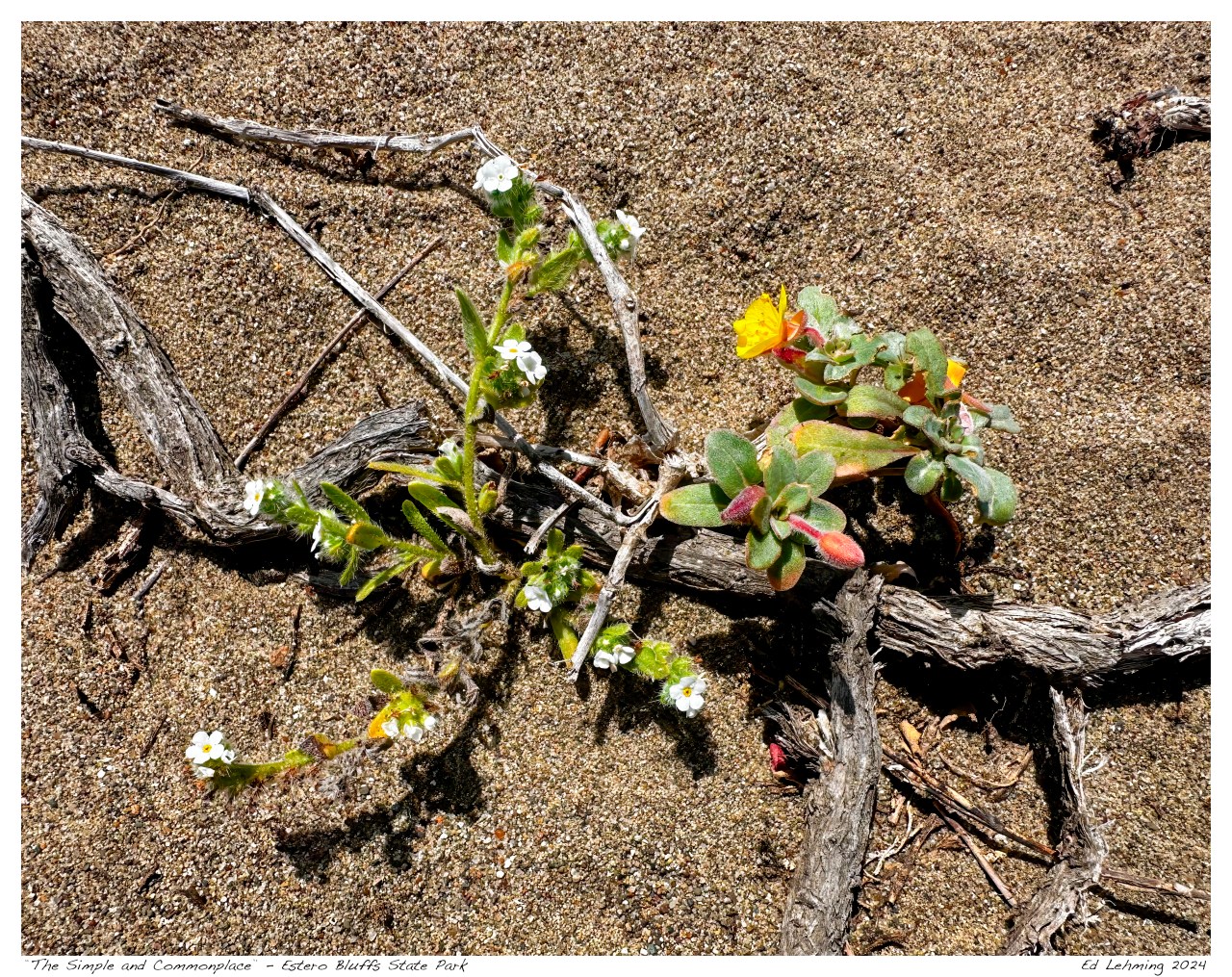 Something that I am ever conscious of, and often observing, is the humble scenes like this; a small cluster of plants creating something beautiful in their simplicity. This composition of the yellow flowered Beach Evening Primrose and the white Lappula Squarrosa immediately caught my attention as I strolled along the shoreline at Estero Bluffs State Park.