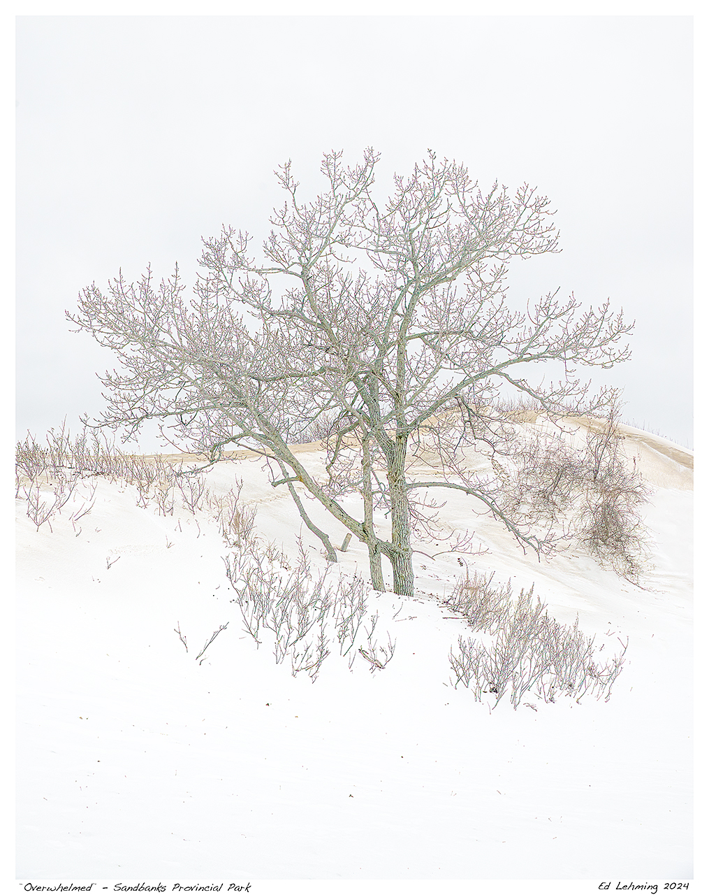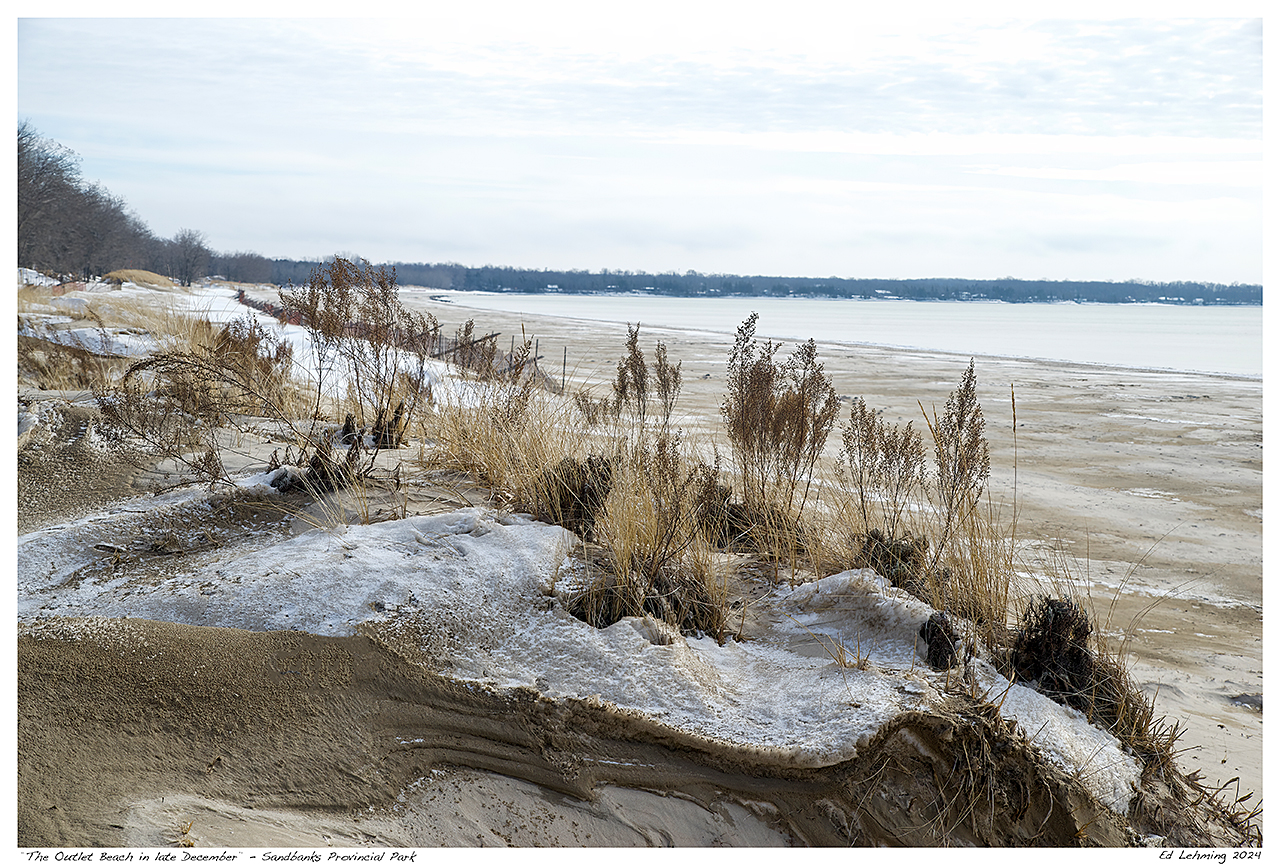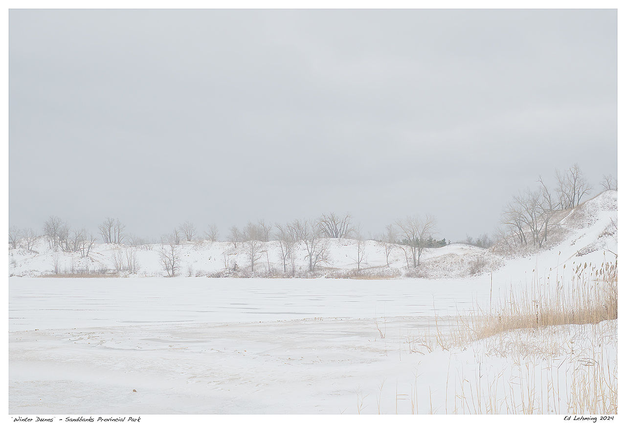 I’m continuing my series of images from Sandbanks Provincial Park. Over Christmas, I spent two days exploring various parts of this beautiful park. The days were cold and often overcast, with brief moments of subdued sunlight. It had snowed quite a bit before Christmas. Still, much of that snow had blown away. A bright dusting remained, letting some vegetation peek through.