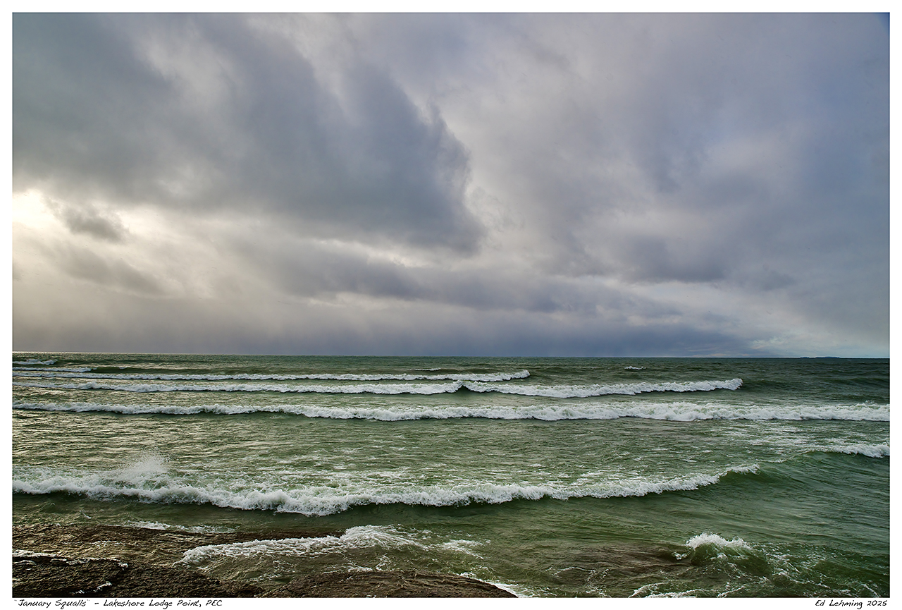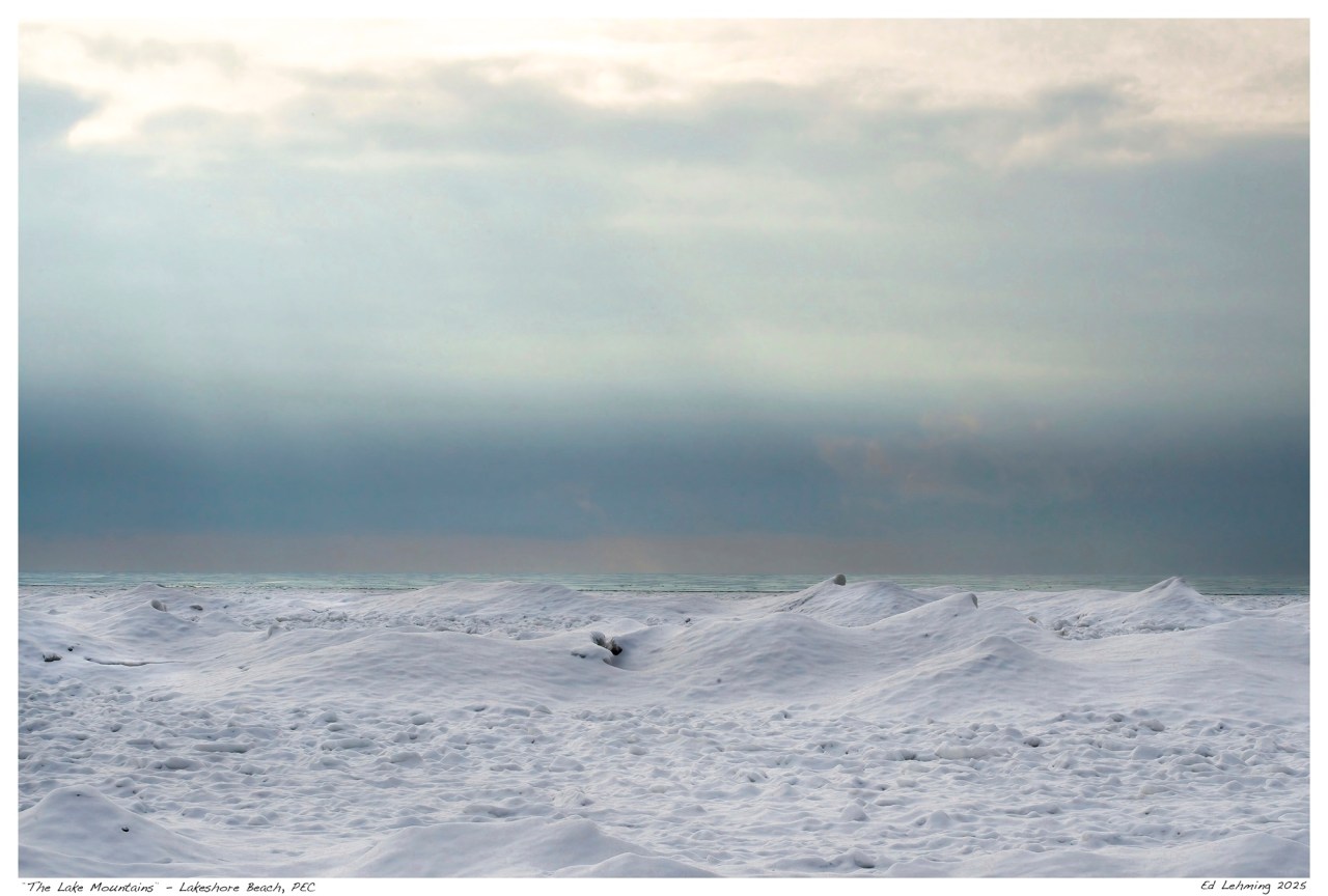 The title for the scene seemed fairly obvious to me, looking across Lake Ontario, particularly, Athol Bay in Ontario’s Prince Edward County. This bay is bounded by Lakeshore Lodge Point to the north and Salmon Point to the south. It’s a large almost square bay that is responsible for the formation of Outlet Beach to the east, a very popular destination for summer beach goers. The winter, is a different story.