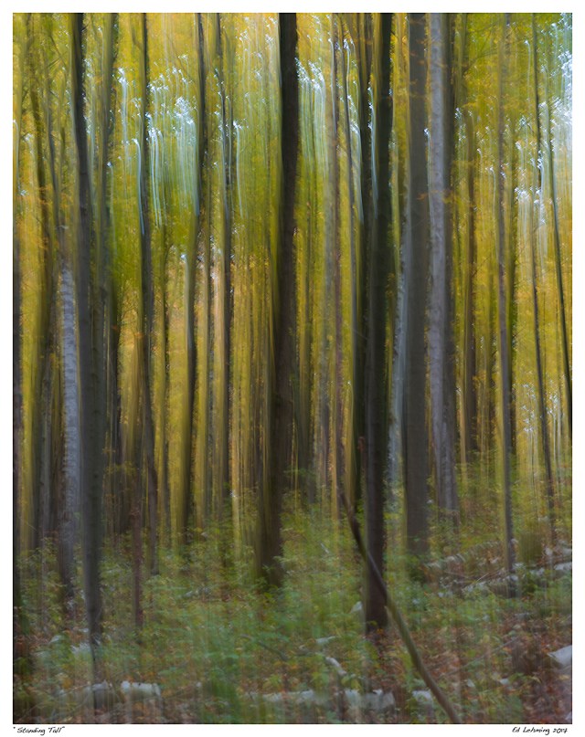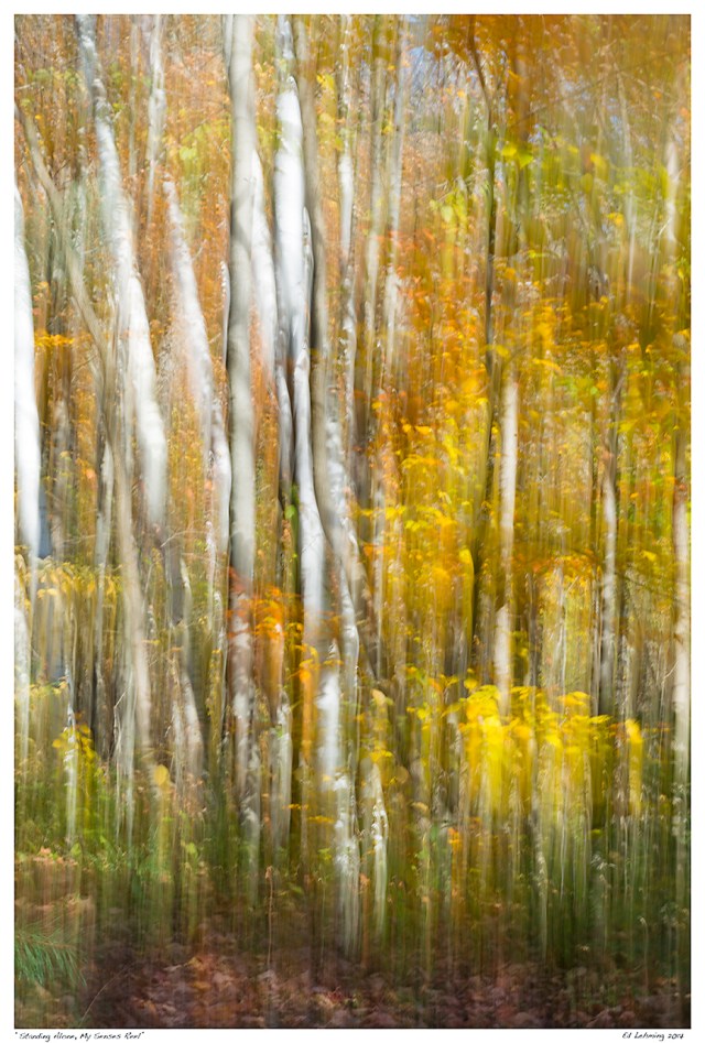 This image is still a part of my “Golden Paths” series. It’s the only one that was made, thus far, outside of the forest, though still a stop on the path, as it emerged from the forest. The bright wood of the tall tree trunks are what drew my attention at first, but it was the movement and brightness of the leaves that caused me to make the image, hoping to capture this moment effectively.
