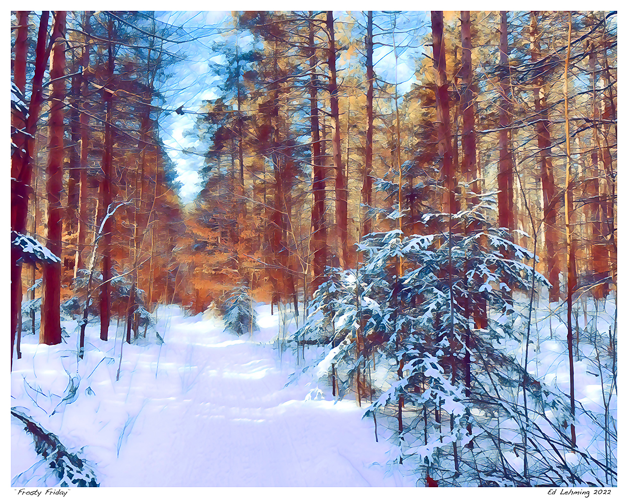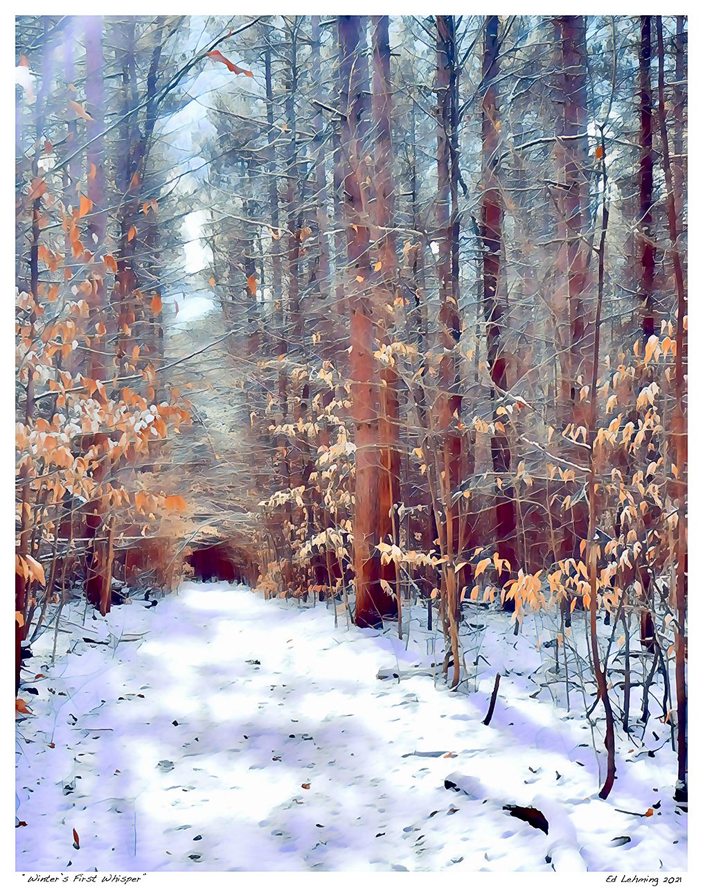 “Around the next bend, the forest glowed in rusty orange, inviting me forward from the snow-filled pines. It truly feels like a time of fire and ice.” – Ed Lehming