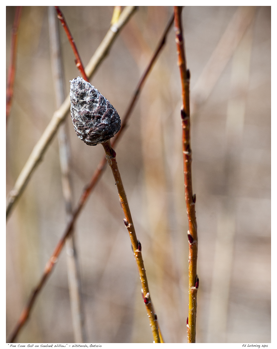 Pinecones on willows? I keep seeing these pin cone-like structures on the ends of sandbank willow branches along Duffins creek and always wondered what they were. They actually are not a natural part of the willow, but rather, the homes of Pinecone Willow Gall-midges (Rhabdophaga strobiloides). These midges secrete a chemical that forces the willow to create these pinecone-like pods to provide the midges food and shelter. The adult midge lays its eggs in the terminal bud of the plant in the early spring and the willow begins to form the pods. The larval infection does not seem to have any adverse effects on the willow. In fact, some of the ‘infected’ branches look larger than the non-infected ones. Bio-chemistry in the insect world!